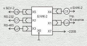 БУИК-2 считывает данные блоков БСУ-2 с периодом около двух раз в секунду. Полученные данные - состояние информационных сигналов - передаются далее на компьютер АРМ диспетчера по интерфейсу RS-485. БУИК-2 поддерживает работу с четырьмя БСУ-2, включенными по каскадной схеме, т.е. принимает до 255 сигналов контролируемого оборудования. БСУ-2 подключается к БУИК-2 при помощи соединителя С9 длинной 0,6 м.