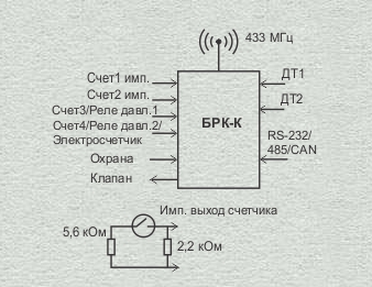 БРК-К используется, как правило, для подключения квартирных счетчиков (4 шт.) воды и газа с импульсным выходом. Частота следования выходных импульсов этих счетчиков не превышает 1 Гц. Для подключения электросчетчика с частотой следования выходных импульсов до 50 Гц используется канал 4. БРК-К устанавливают в санузле квартиры или в частном доме. БРК-К осуществляет подсчет количества электрических импульсов с нарастающим итогом по измерительному каналу (1 - 4) суммированием электрических импульсов, поступающих от счетчиков с импульсным выходом, хранение накопленных данных в энергонезависимой памяти блока. Данные сумматоров передаются по радиоканалу 433 МГц с заданной периодичностью, например, раз в час.
