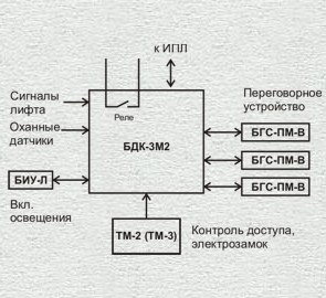 БДК-3М2 подключается к информационно-питающей линии и работает под управлением мастер-устройства интерфейса, например, БКД-МЕ, БКД-М. БДК-3М2 обеспечивает канал цифровой голосовой связи с мастер-устройством интерфейса ИПЛ по методу кодирования m-Law ITU-T G.711 со скоростью потока данных 64 кбит/с. К блоку БДК-3М2 подключаются три переговорных устройства БГС-ПМ или БГС-ПМ-В, блок контроля и управления освещением БИУ-Л, контроллер ТМ-СЛДКС-2 или ТМ-СЛДКС-3. БДК-3М2 устанавливается в машинных помещениях лифтов или электрощитовых, в технических помещениях. К блоку БДК-3М2 могут быть подключены релейные лифтовые сигналы вида «сухой контакт» вместо охранных шлейфов для обеспечения минимального уровня диспетчеризации лифтов.