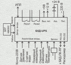 Контроллер БКД-UPS с резервным источником питания +24В совместно с контроллером БКД-ПК-RF используется для диспетчеризации водозаборных скважин по каналу сотовой связи GSM. Контроллер БКД-UPS позволяет подключать датчики давления воды, расходомер, датчик температуры воздуха, датчик затопления приямка водозаборного узла, считыватель ключа-идентификатора Touch Memory, iButton для контроля доступа в помещение водозаборной станции, контролировать три универсальных дискретных сигнала шкафа управления насосами и три аналоговых универсальных входа. БКД-UPS также является мастер-устройством системы и предназначен для считывания состояния по информационно-питающей линии связи ИПЛ дополнительных адресных блоков системы, например, блока управления БИУ-DIN , дальнейшей передачи информации по интерфейсу RS-232 в управляющий контроллер БКД-ПК-RF, управления адресными блоками посредством команд управляющего контроллера, а также для электропитания адресных блоков по ИПЛ стабилизированным постоянным напряжением 27 В. Логика работы системы, в которой используется БКД-UPS, обеспечивается на уровне управляющего контроллера БКД-ПК-RF, подключенного по интерфейсу RS-232.  |