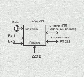 Контроллер БКД-DIN является мастер-устройством системы и предназначен для считывания состояния адресных блоков системы по информационно-питающей линии связи ИПЛ, дальнейшей передачи информации по интерфейсу RS-232 в компьютер системы, управления адресными блоками посредством команд управляющего компьютера, а также для электропитания адресных блоков по ИПЛ стабилизированным постоянным напряжением 24 В. Контроллер предназначен для установки на DIN рейку в монтажный шкаф. Логика работы системы, в которой используется БКД-DIN, обеспечивается на уровне компьютера АРМ, шлюза голосовой связи Н.323 и т.п. Контроллер обеспечивает канал цифровой голосовой связи по методу кодирования m-Law ITU-T G.711 со скоростью потока данных 64 кбит/с.  Контроллер имеет два дискретных входа Вх 1,2 типа «сухой контакт» универсального назначения. Также к контроллеру можно подключить считыватель электронного ключа iButton. Состояние дискретных входов и коды приложенных ключей передаются контроллером в управляющий компьютер по интерфейсу RS-232. |