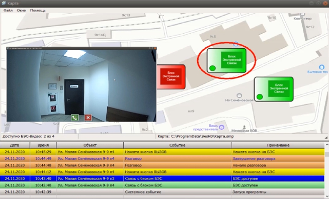 Программу блока экстренной голосовой и видеосвязи SES HD устанавливают на компьютер оператора системы экстренной голосовой связи. Взаимодействие компьютера с блоками БЭВС осуществляется по сети Ethernet. Программа SES HD выполняет следующие функции: - прием вызова диспетчера от блоков экстренной связи БЭВС; - двухстороннюю голосовую связь диспетчера с блоками БЭВС; - просмотр диспетчером видеоизображения БЭВС в режиме "on line"; - просмотр диспетчером видеоизображения из архива БЭВС; - прослушивание аудиозаписей разговоров из архива; - просмотр журнала событий. Программа SES HD на компьютере АРМ оператора системы экстренной связи отображает пункты экстренной голосовой и видеосвязи на карте района. При вызове диспетчера объект «БЭВС» на карте будет мигать желтым цветом и звучит фраза «Внимание! Вызов диспетчера». Появится окно управления разговором и окно с видеоизображением.