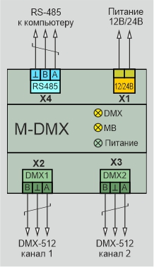 M-DMX выполняет функции контроллера и преобразователя интерфейсов MODBUS и DMX512. Внешнее устройство управления светотехническим оборудованием реализует различные сценарии управления освещением и формирует кадры в формате MODBUS. M-DMX осуществляет прием этих кадров и преобразует их в формат протокола DMX512. Блок выполняет функцию сплиттера, формирует два канала управления светотехническим оборудованием по сети DMX512. Модуль версии 2 позволяет записать сценарий управления освещением виде скриптовой программы в постоянную память модуля, который воспроизводится автономно. Блоком обеспечивается аппаратная реализация различных световых эффектов (фейдинг и проч.). Выходы линий DMX512 имеют гальваническое (оптическое) разделение друг от друга и от интерфейса RS-485. M-DMX также осуществляет контроль напряжения питания, имеется светодиодная индикация подачи питания, передачи данных по интерфейсам RS-485 и DMX512.
