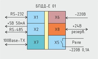 Электропитание БПДД-Е 01 осуществляется от сети переменного тока напряжением 220 В. Блок имеет вход/выход напряжения +24 В для электропитания внешних устройств. Ток в этой цепи ограничен значением 0,1 А. Этот вход/выход может использоваться для резервного питания блока.
