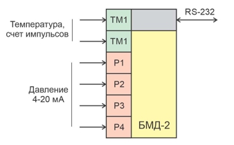 Блок мониторинга давления БМД-2 предназначен для сбора информации, поступающей от любых первичных датчиков с унифицированным аналоговым токовым выходом (0-20) мА. БМД-2 обеспечивает сбор информации по 4 входным токовым каналам, аналоговоцифровое преобразование, первичную обработку, передачу измерительной информации по интерфейсу RS-232 внешним устройствам. Также имеется 2 входа для подключения цифрового температурного преобразователя DS18S20 или сигнала «сухой контакт» (счетный вход).  |