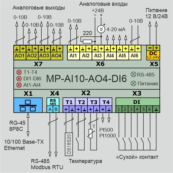 Модуль расширения MP-AI10-AO4-DI6 выполняет следующие функции: