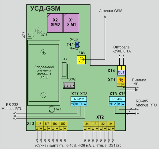 - Интерфейс RS-232/RS-485 для подключения электросчетчиков и проч. для передачи данных на сервер