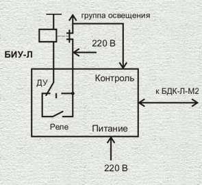 БИУ-Л подключается к блокам лифтового диспетчерского контроля БДК-3М2, БДК-4М2, БДК-Л-3М2, БДК-Л-4М2, БДК-4М2-УКЛ, длина 4-х жильного кабеля "витая пара" не более 100 м. БИУ-Л осуществляет контроль текущего состояния фидеров электроосвещения лестничных клеток, входов в подъезды. Проверяется наличие напряжения питания на соответствующих группах.