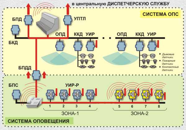 - Подача извещения о пожаре Подача извещения о пожаре осуществляется поворотом рычага вниз. При этом пломбировка рычага нарушается. Сигнал извещения о пожаре передается диспетчеру на БКД-Р в форме звукового сигнала «СИРЕНА», место сработавшего УИР указывается на текстовом индикаторе БКД-Р. БКД-Р посылает сигнал включения световой и звуковой сигнализации всем УИР-Р находящемся в зоне сработавшего УИР. Через БПДД, извещение о пожаре передается на пульт ОПП и на центральной пост охраны, по информационной или телефонной линии (см рис). - Оповещение персонала о пожаре Оповещение производится звуковым и световым оповещением Звуковой сигнал издает УИР. Вид сигнала - прерывистый одно-тональный сигнал. Безопасное направление эвакуации индицируется прерывным зеленым свечением светодиодов «?», «?», расположенный на лицевой панели извещателя. Выбор безопасного направления эвакуации осуществляет БКД-Р на основе полученной информации о наличии сработавших пожарных извещателей этого объекта - Громкоговорящая связь Вызов диспетчера на голосовую связь происходит при нажатии на кнопку «Вызов». Это индицируется мигающим красным светодиодом «Микрофон» с частотой мигания 4Гц. В случае приема контроллером БКД-Р вызова частота мигания станет 1 Гц. Включение микрофона индицируется непрерывным свечением светодиода «Микрофон». На время включения громкоговорителя светодиод погашен. УИР-Р обеспечивает громкоговорящую дуплексную связь с диспетчером, а также между несколькими УИР-Р под управлением диспетчера. Диспетчер передает сообщения о возникновении опасности (пожаре), инструкции по эвакуации и принимает сообщения от персонала в месте установки УИР-Р. При обнаружении речи и характерных аварийных звуках в охраняемый период выдается тревога. Программа выполнена по самообучающейся технологии и не аварийные звуки попадают в образцы «не тревожных» звуков и согнал тревоги при поступлении таких звуков на выдается. Для усиления охранных функций звукового мониторинга можно применять пассивные звуковые ловушки Скрипящий порошок (коврик) – характерно хрустит при хождении по нему нарушителя |