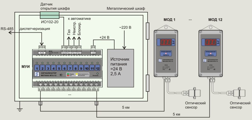 МГА-12 является автоматическим стационарным многоканальным прибором непрерывного действия с диффузионной подачей газа с выносными датчиками метана. - Сигнализатор состоит из модуля управления и индикации МУИ, к которым подключаются модули оптического датчика МОД с выносным инфракрасным датчиком газа в количестве (1-12) шт.