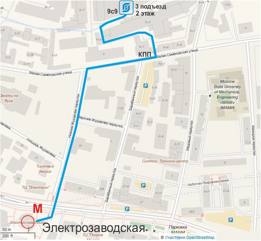 Схема проезда: м. Электрозаводская, далее, налево, перейти по подземному переходу, далее по Нижнему Журавлеву переулку до ул. Малая Семеновкая, направо до КПП "БЦ на Семеновской", всего около 600 м от станции метро.